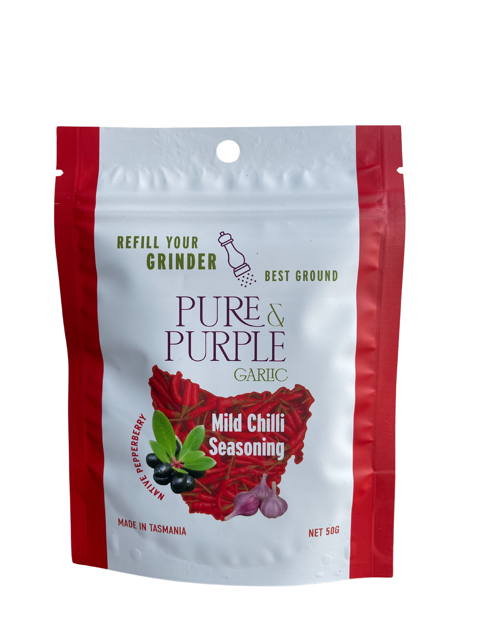 Gold Medal Winner at the 2022 Sydney Royal Fine Food Show! Our Chilli Mix in a resealable pouch, to refill your Chilli Mix adjustable grinder or use in a mortar and pestle! Perfect as a rub, or with olive oil as a dressing! NEW! Ingredients: Tasmanian purple garlic, Tasmanian native pepper berries (including leaves), pure Australian inland salt and chillies. Chemical and spray free, grown in rich organic soil. Gluten Free. Net Weight 50g Handy Tip! Keep this stored in a dry, dark place, but don’t worry if it becomes soft, just sprinkle it onto a baking tray and dry it in a warm oven for a few minutes!