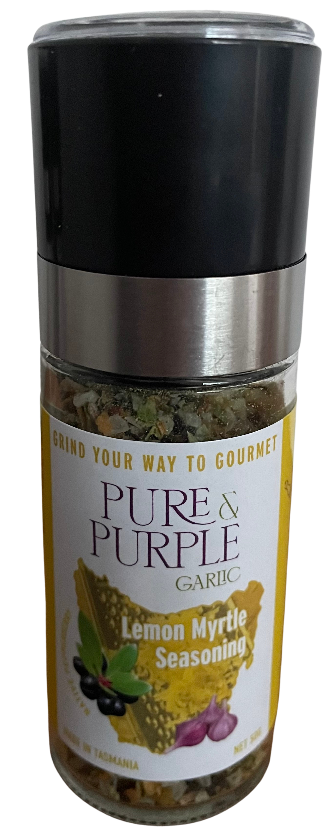 Gold Medal Winner at the 2022 Sydney Royal Fine Food Show! Our Lemon Myrtle Mix in a refillable, adjustable grinder! Perfect as a rub, or with olive oil as a dressing! It’s delicious with seafood and chicken! Ingredients: Ingredients: Tasmanian purple garlic, Tasmanian native pepper berries(including leaves), pure Australian inland salt, lemon myrtle and lemon zest. Chemical and spray free, grown in rich organic soil. Gluten Free. Net Weight 50g Handy Tip! Keep this stored in a dry, dark place, but don’t worry if it becomes soft, just sprinkle it onto a baking tray and dry it in a warm oven for a few minutes!